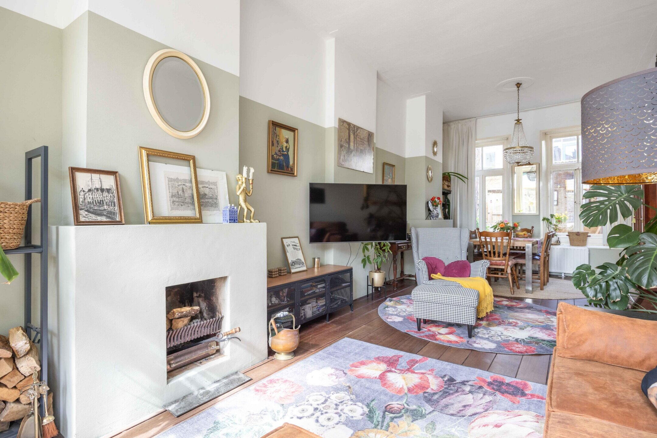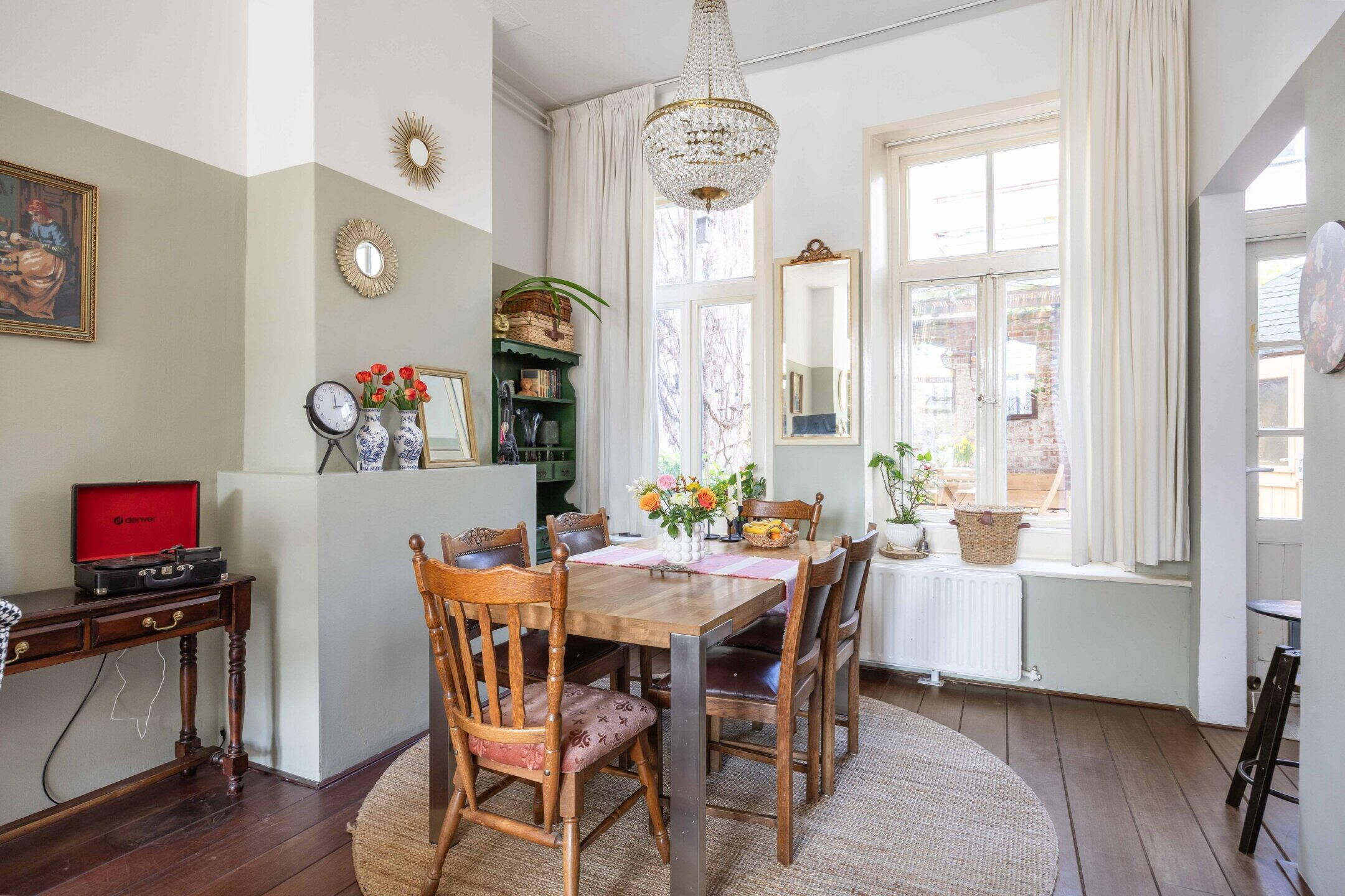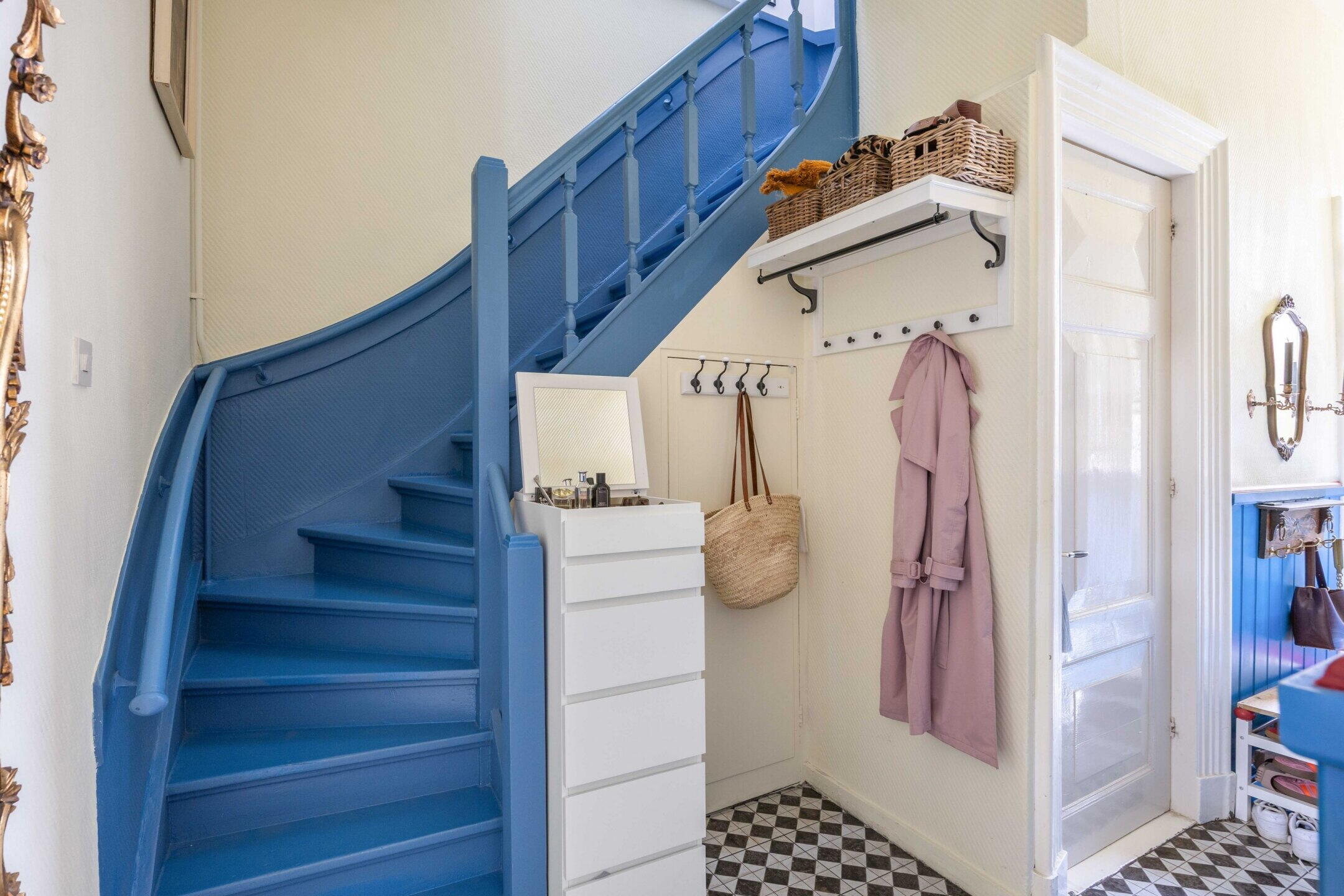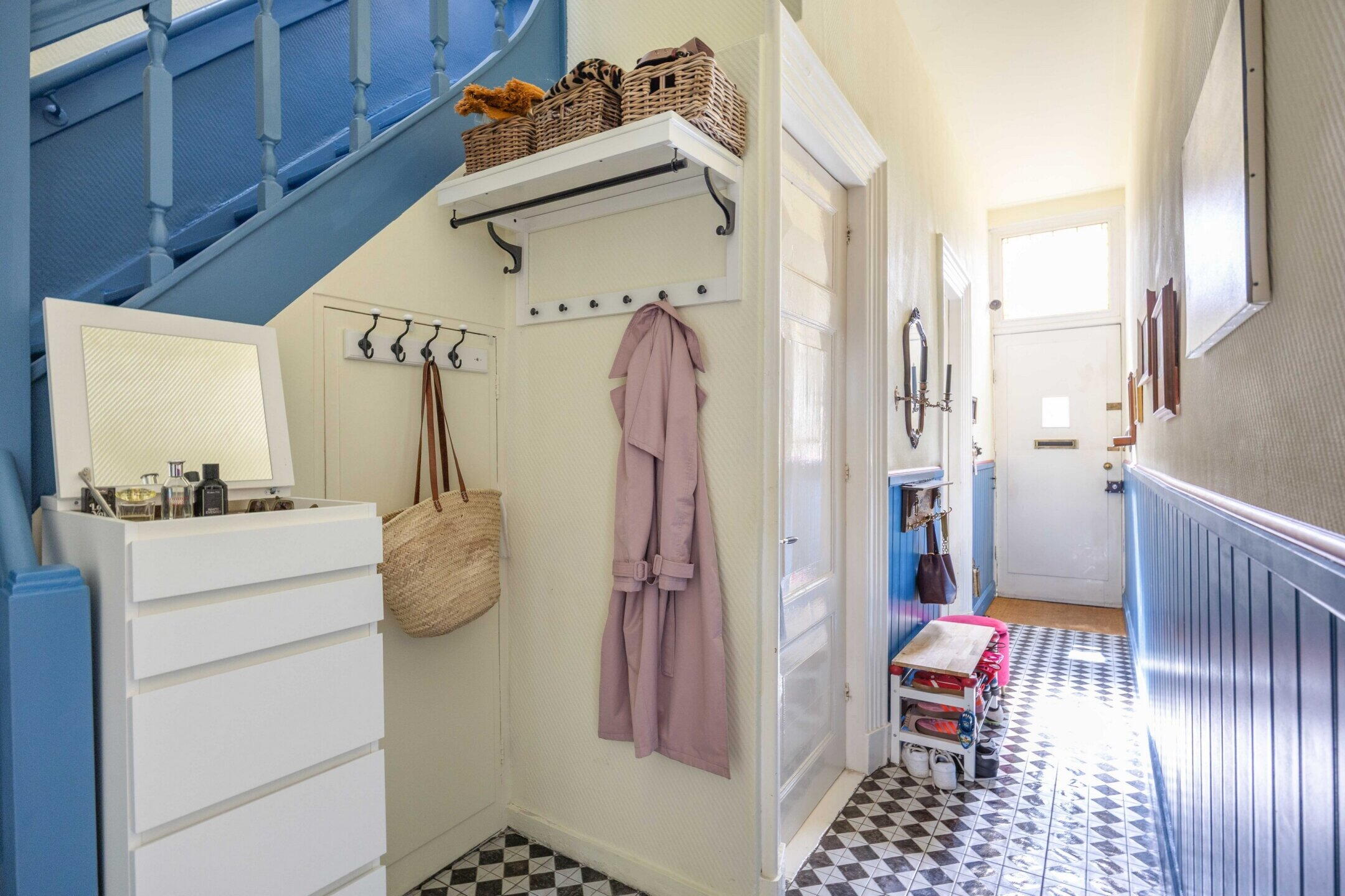 De woning beschikt over 103 m² woonoppervlak, verdeeld over twee woonlagen met in totaal vijf kamers, waarvan drie slaapkamers en de perfecte thuiswerkplek. De kleurrijke hal zet meteen de toon: speelse elementen, hoge plafonds, een nieuwe tegelvloer en lambrisering met knipoog naar het verleden en zorgvuldig bewaarde details.
