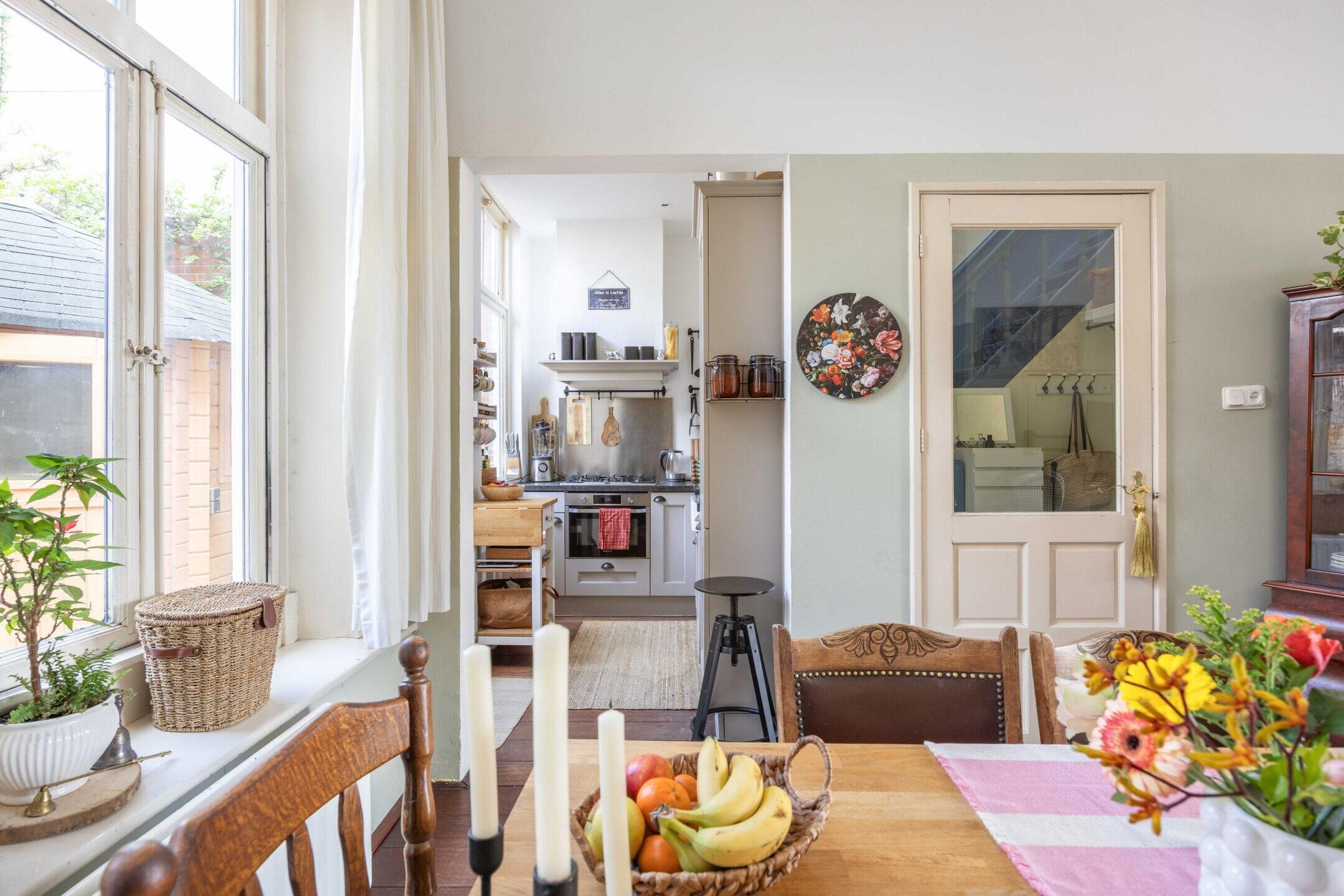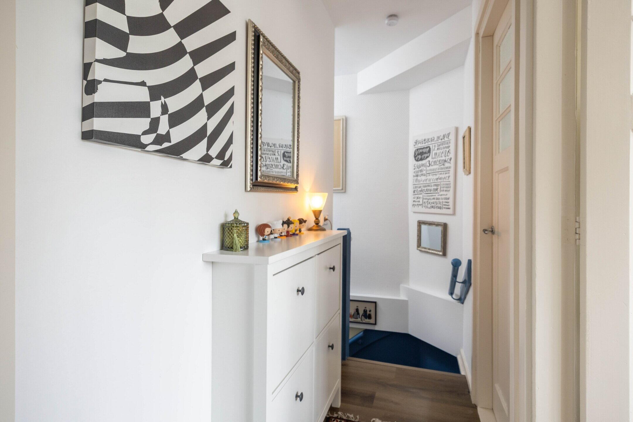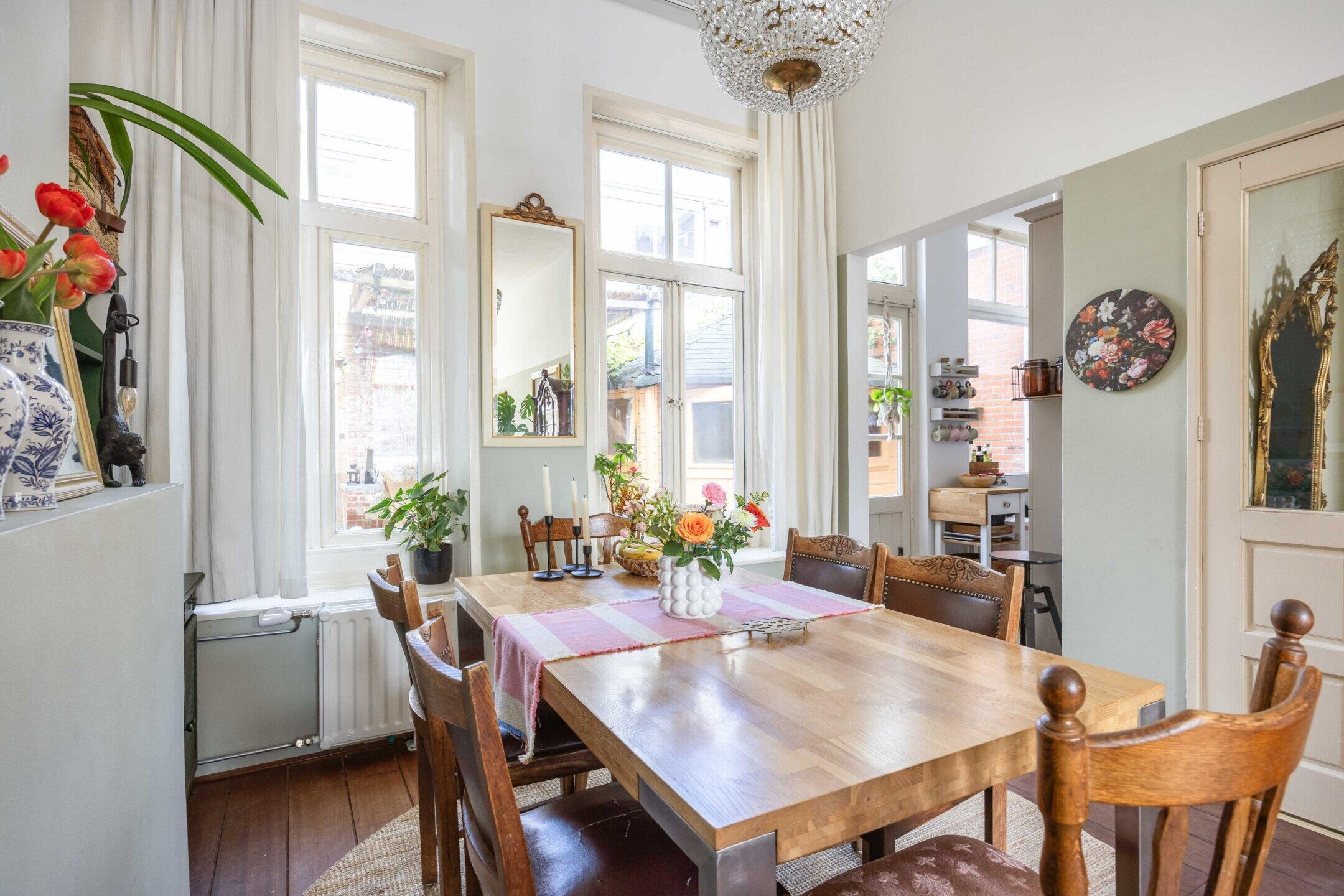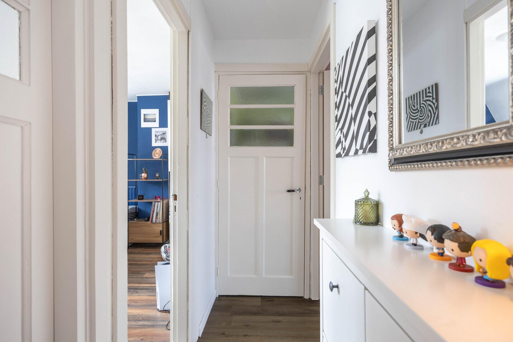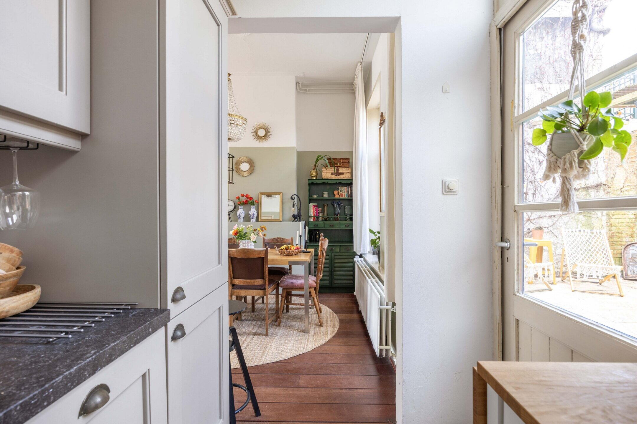 De woning beschikt over 103 m² woonoppervlak, verdeeld over twee woonlagen met in totaal vijf kamers, waarvan drie slaapkamers en de perfecte thuiswerkplek. De kleurrijke hal zet meteen de toon: speelse elementen, hoge plafonds, een nieuwe tegelvloer en lambrisering met knipoog naar het verleden en zorgvuldig bewaarde details.