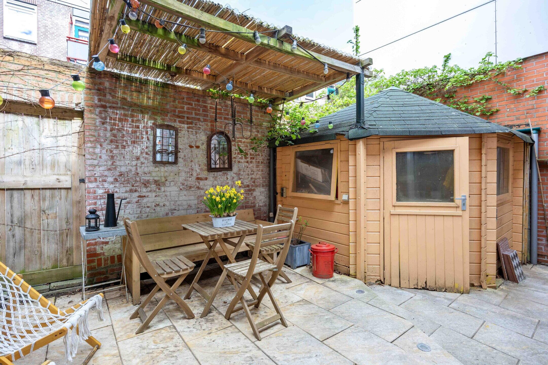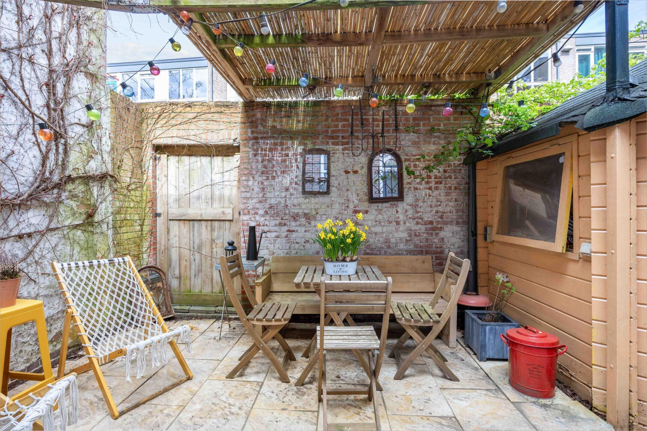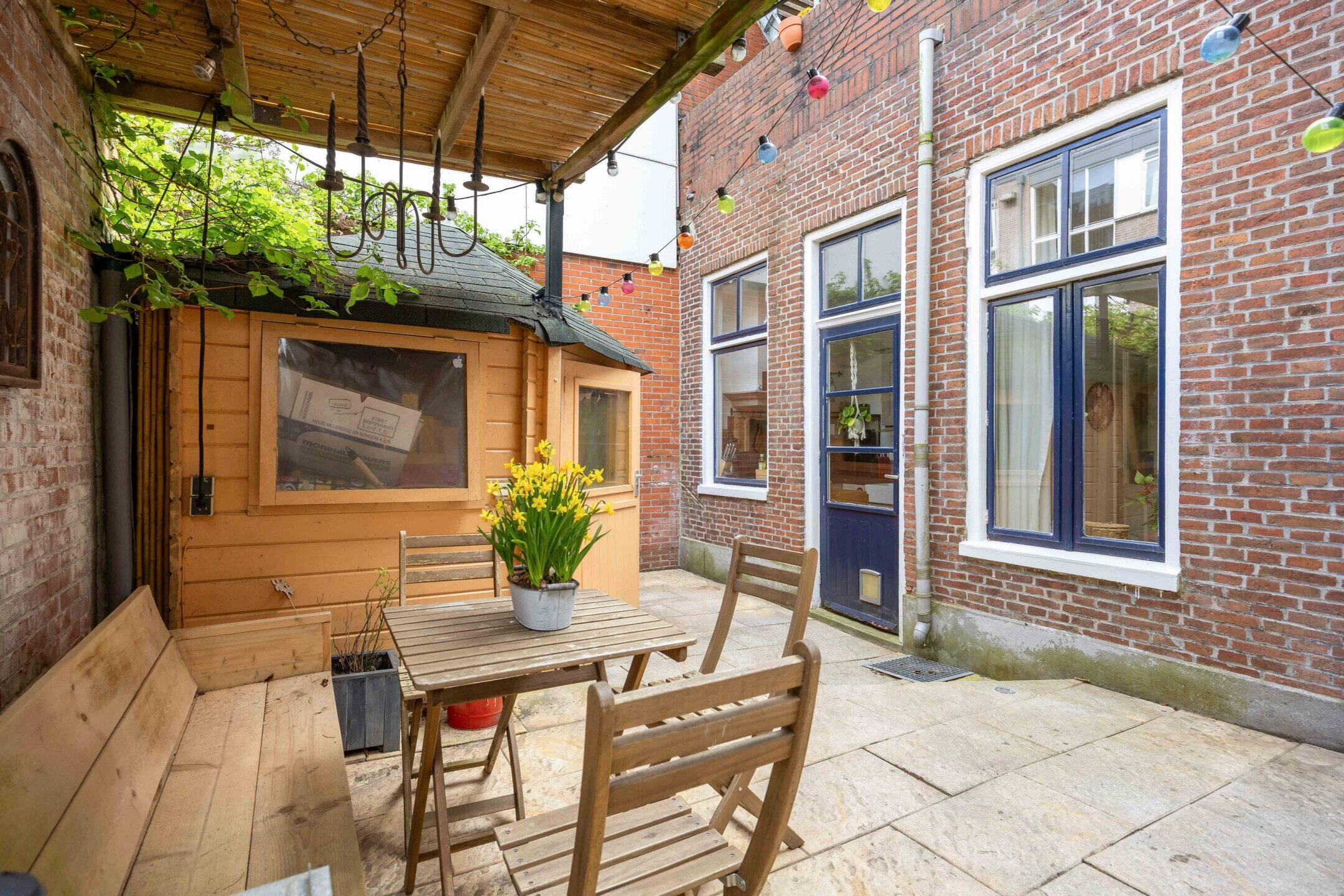 De achtertuin biedt een rustige en groene plek om afgesloten tot rust te komen. Met een vrijstaande houten berging voorzien van elektra heb je veel mogelijkheden. Het echte buitenleven speelt zich af op het dakterras, een zeldzame luxe in deze omgeving.