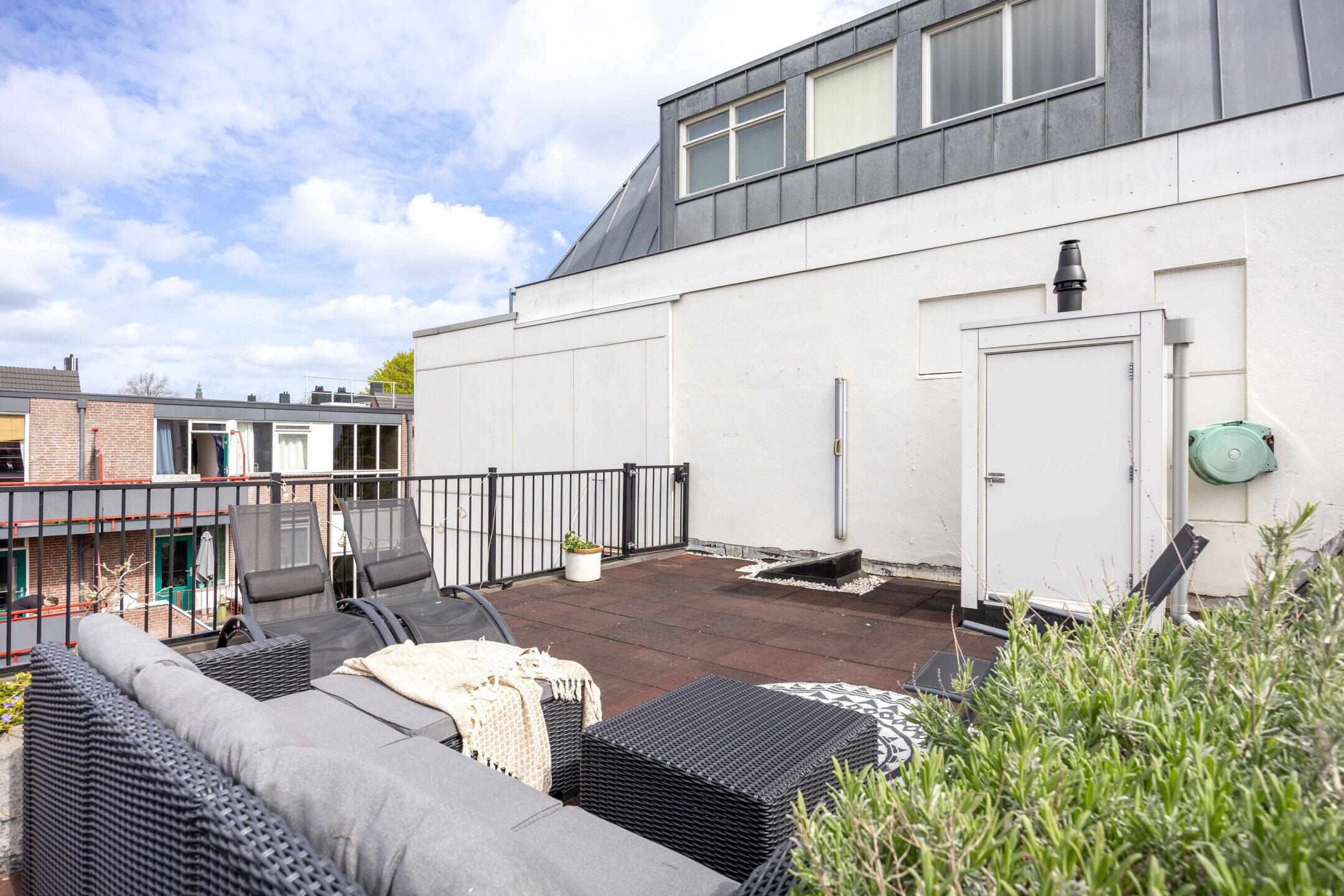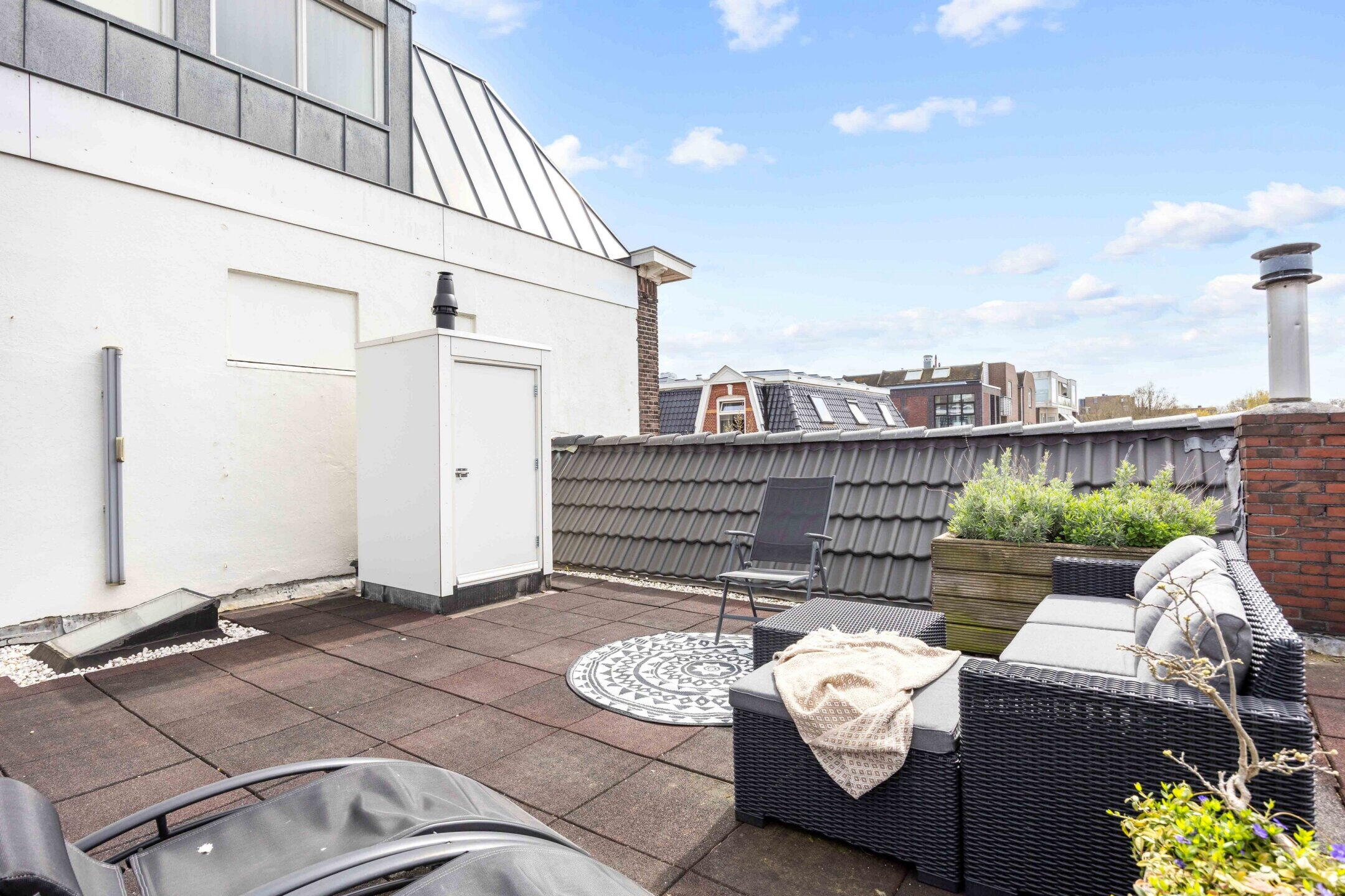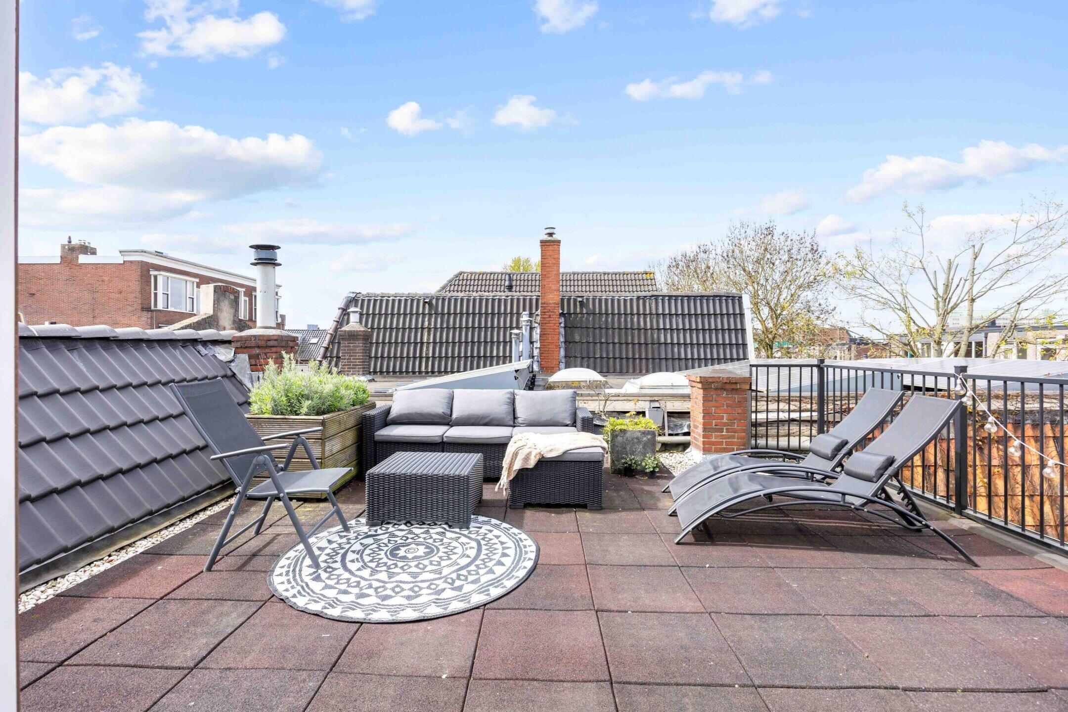 Dit is één van de weinige woningen in de buurt waar je de hele dag de zon vangt: van de eerste ochtendstralen tot het laatste avondlicht, dit dakterras maakt elke dag een beetje beter.